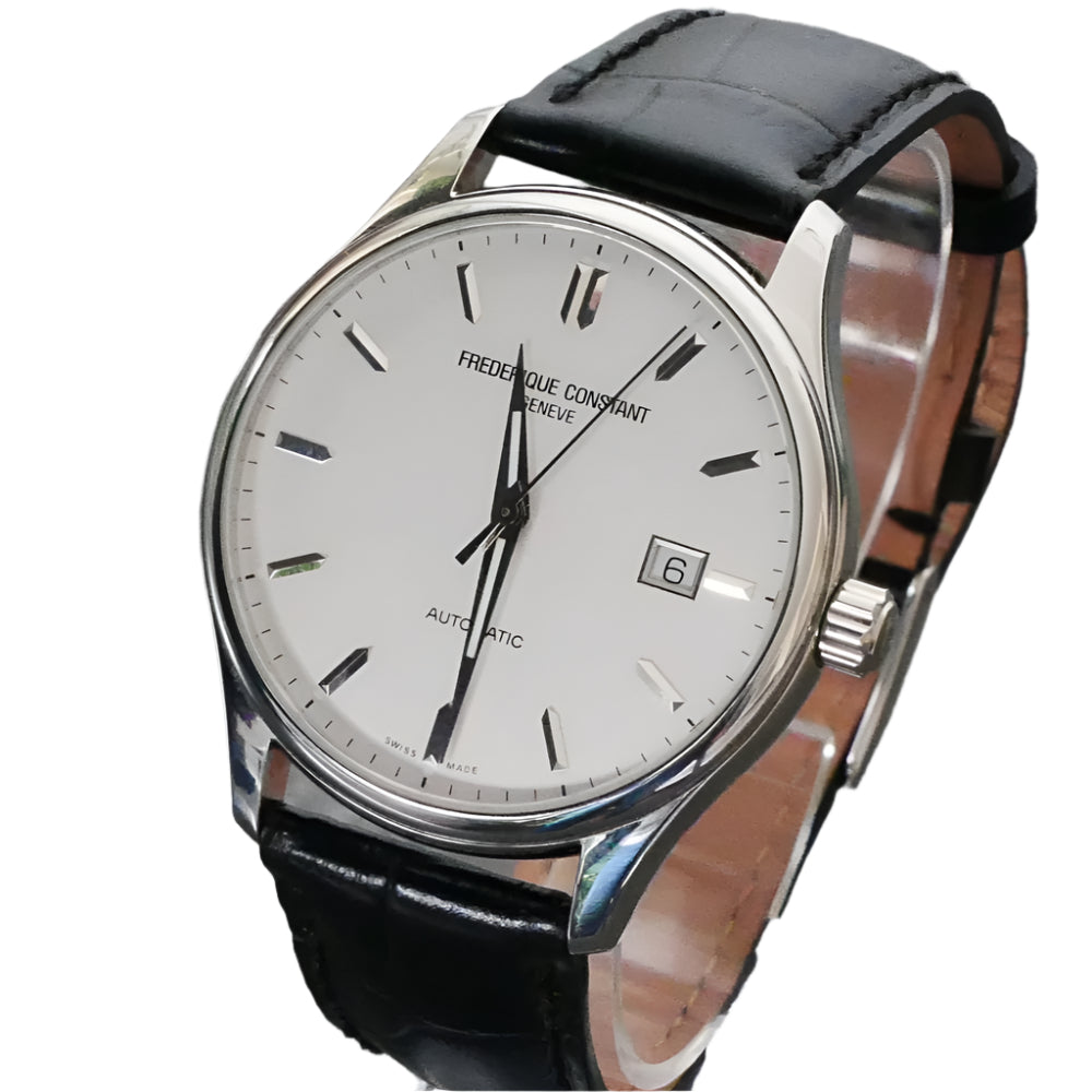 The Frederique Constant FC-303S5B6 offers classic dress watch styling with Swiss-made reliability. Featuring a 40mm polished stainless steel case, silver dial with Roman numeral hour markers, and an automatic movement with date display at 3 o’clock, this model delivers understated elegance and everyday practicality.